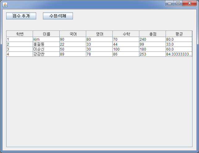 + " ((kor+eng+mat)/3.0) as avg from score ";