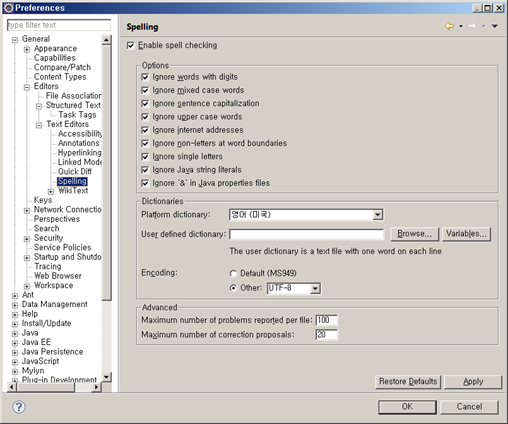 General-Editors-Text Editors-Spelling-Encoding 속성을 UTF-8로 변경