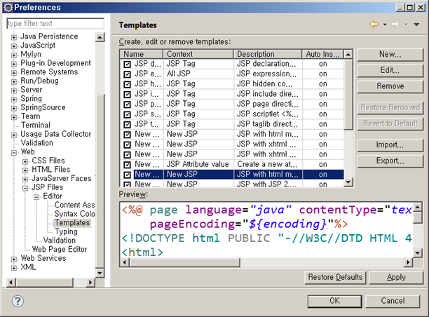 Window → Preferences → Web → JSP Files → Editor → Templates → New JSP File(html) 선택 후 → Edit 클릭