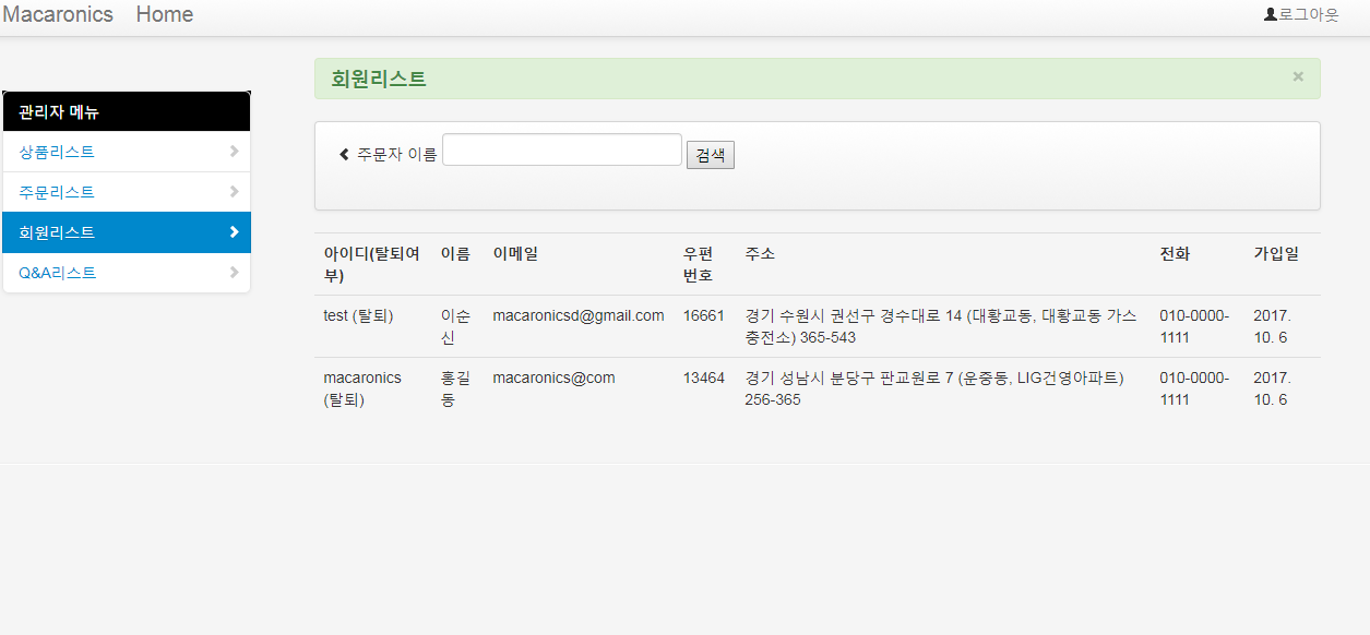 관리자 회원 리스트 화면