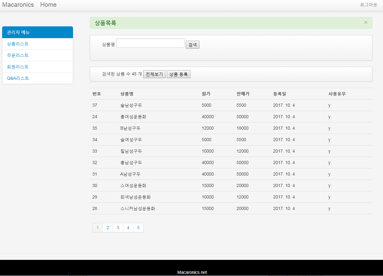 관리자 상품 리스트 화면