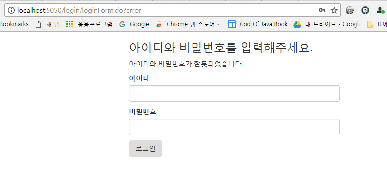 아이디와 비밀번호를 잘못 입력했을 때 다음과 같은