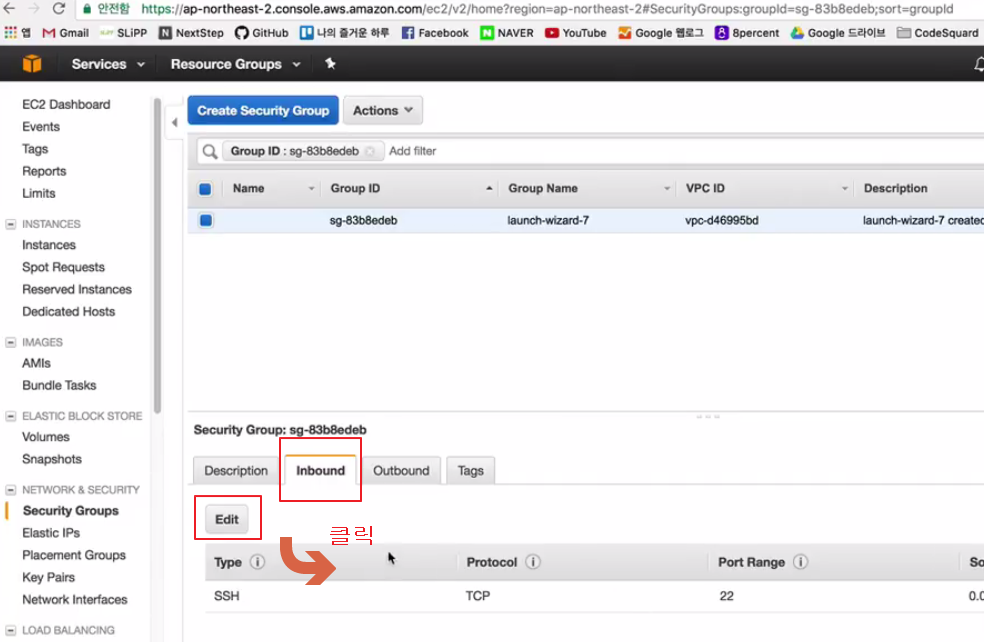 - 선택한 서버 하단에서 Security Group 의 우측 링크를 클릭한다.