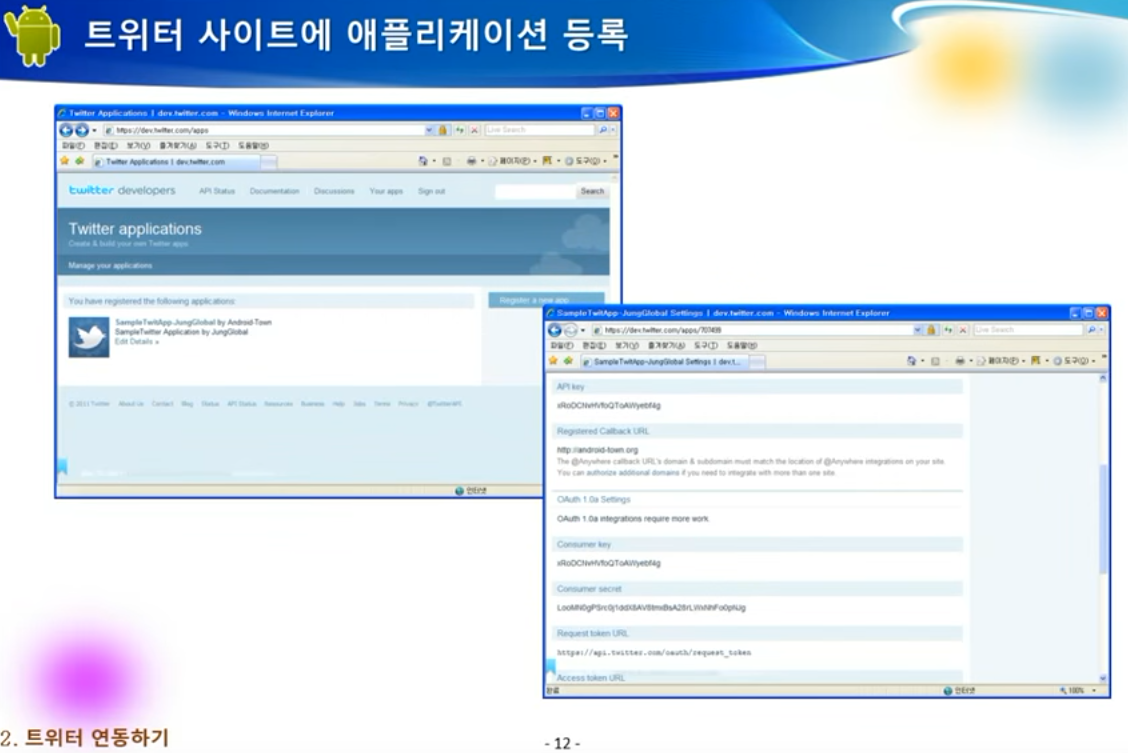 먼저 트위터의 인증코드의 key 값과 Secret 값을 가져온다.