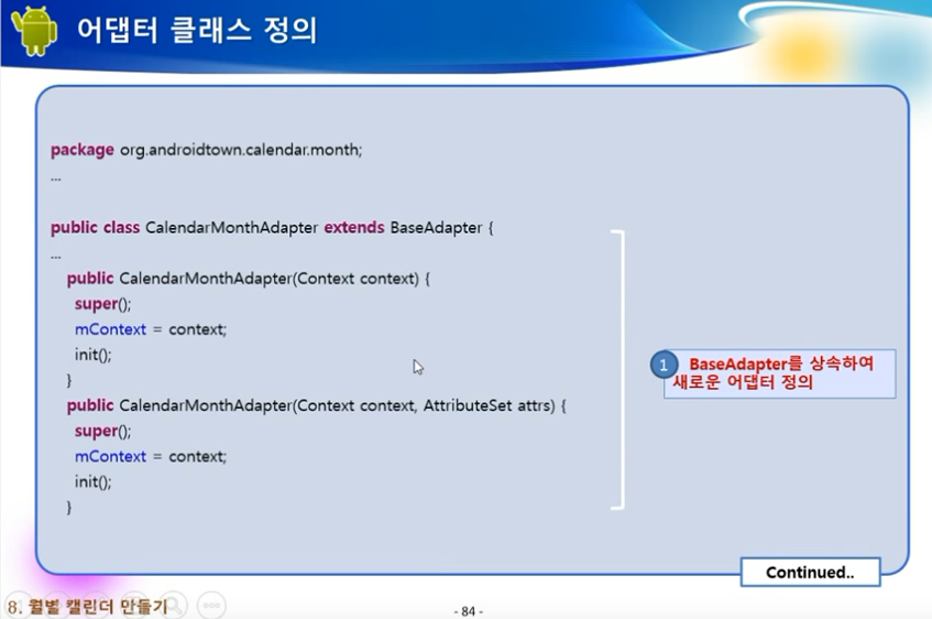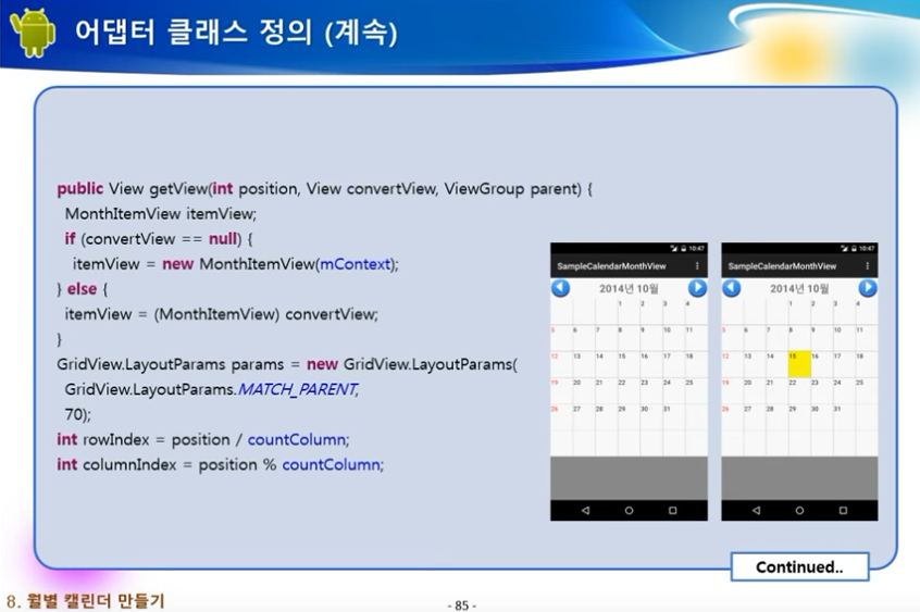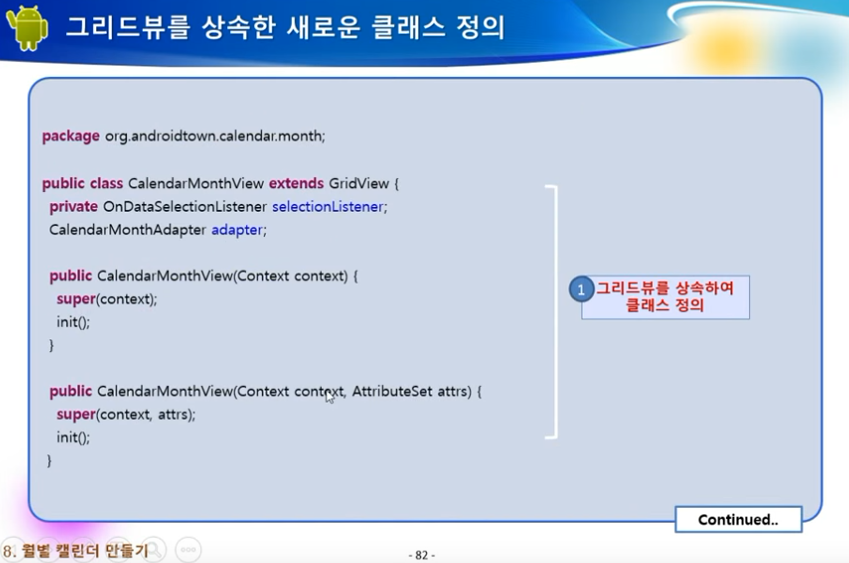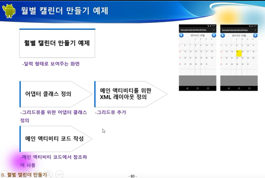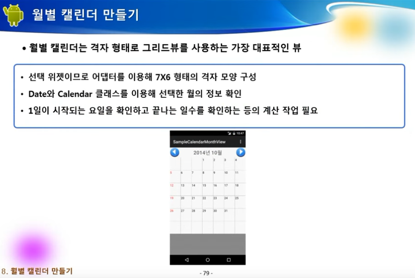 * 그리드뷰를 이용해 월별 캘린더를 만드는 방법에 대해 알 수 있습니다.