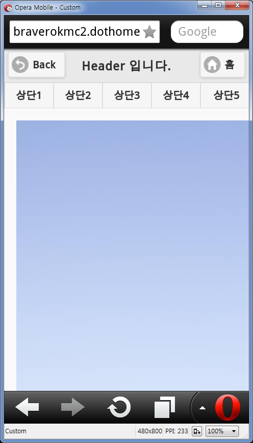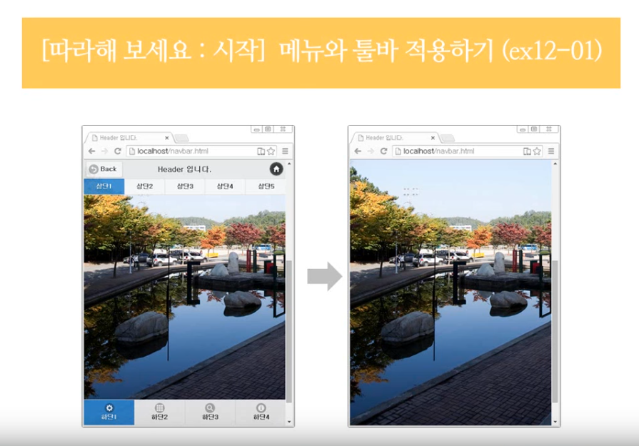 위 예는 Header 영역에 data-role =“navbar”를 사용해서 상단에 툴바를 만든 모습입니다. 이때 툴바의 단추 중에 포커스를 주고 싶은 것이 있으면 li 엘리먼트의 특성에