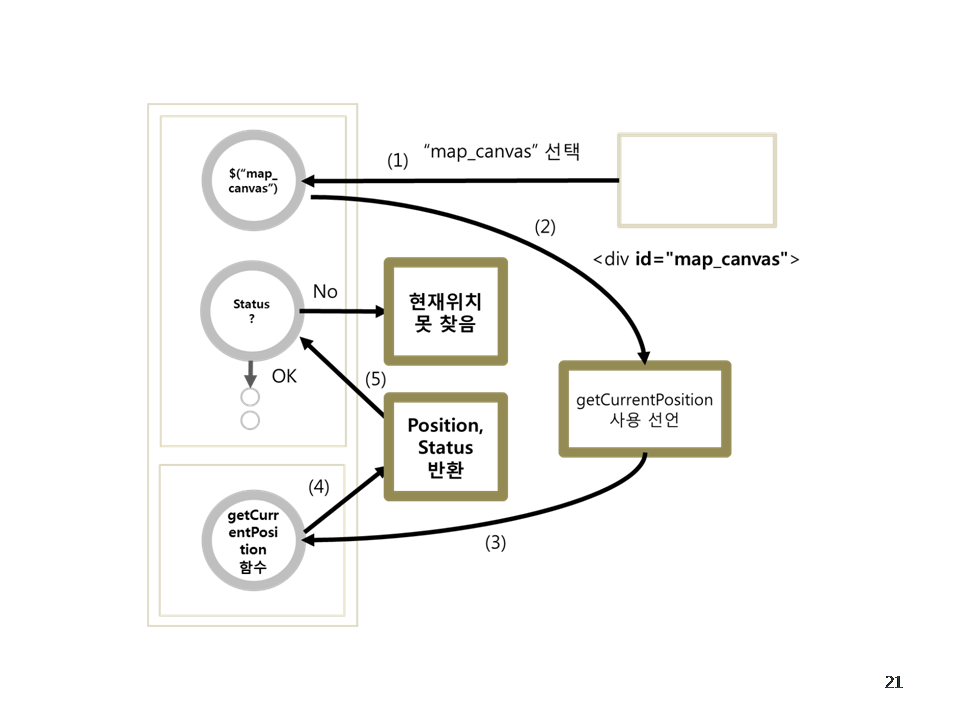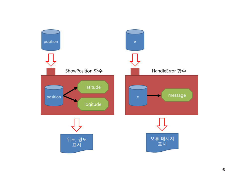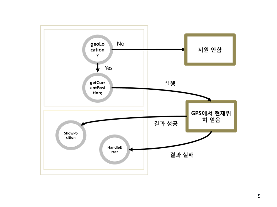 navigator 객체에 들어 있는 geolocation 속성의 반환값이 True이면 GeoLocation을 지원하며, 반대로 False 이면 지원하지 않습니다. 또한 geolocation 속성에 들어 있는 getCurentPosition 메서드를 호출하면 현재의 위치정보를 얻을 수 있습니다. 이때 매개변수로 콜백 함수를 전달해야 합니다. 콜백함수란 실행이 끝난 뒤에 호출되는 함수를 의미합니다. 여기서는 얻은 위치값을 화면에 출력할 목적으로 showPosition함수가 실행되고, 만약 에러가 발생하면 그 내용을 알기 위해 handleError 함수가 사용됩니다.