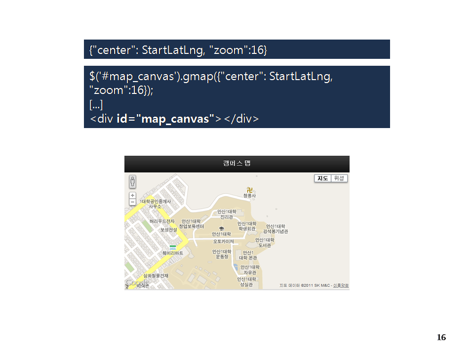 위 경우는 #map_canvas라는 ID 선택자가 지정된 div 엘리먼트에 지도를 표시하는 경우입니다. 먼저 JQuery 의 $(“#map_canvas”)를 사용해서 div 엘리먼트를 선택합니다. 그 위치에 gamp을 사용해서 지도를 하나 만들어 주는데 ‘center’ 속성을 사용해서 StartLatLng 객체 변수에 들어 있는 위도/경도 값을 대입합니다. 또한 ‘zoom’ 속성을 사용해서 16배 확대를 지정합니다. 그러면 간단하게도 이 명령어 하나로 div 엘리먼트 안에 원하는 지도가 나타납니다.