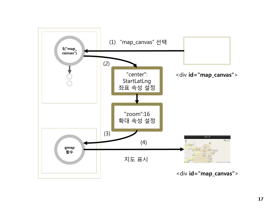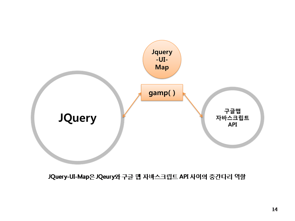 그 다음에 JQuery를 사용해서 HTML 중에서 원하는 태그만 선택자로 찾은 후에 JQuery-UI-Map 의 핵심 명령인 gmap을 실행합니다. gmap 은 새로운 지도를 하나 생성하면서 동시에 구글 맵 자바스크리트 API를 실행하도록 도와줍니다. 구글 맵 자바스크립트 API에서 필요한 메서드 실행이나 다양한 속성값 변경을 쉽게 처리할 수 있습니다. 메서드를 실행할 때는 콜백 함수를 전달하면 되고 속성값을 변경할 때는 JSON 형식으로 속성 이름과 속성값을 쌍으로 묶어서 전달하면 됩니다. 이처럼 JQuery-UI-Map 은 JQuery 와 구글 맵 자바스크립트 API 사이의 중간 역할을 해줍니다.