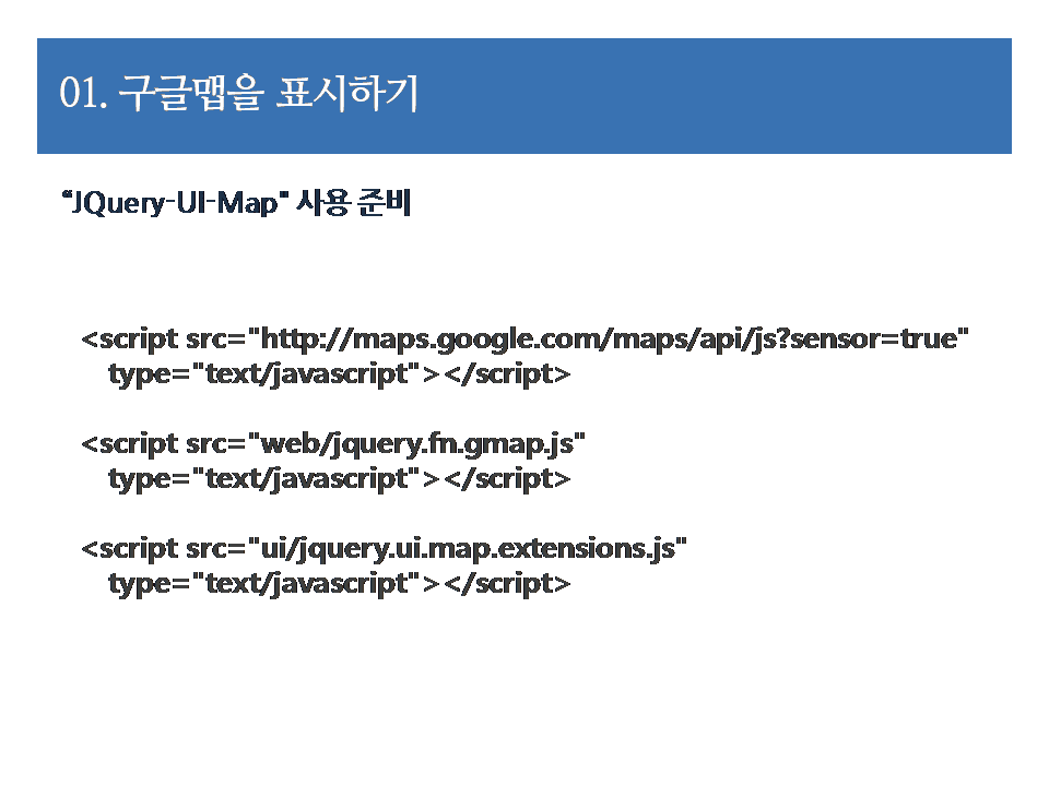 다음에서 첫 번째 것은 구글 맵 자바스크립트 API를 사용하기 위해 CDN을 포함시킨 것입니다. 특히 GPS 센서가 들어 있는 스마트폰의 기능을 사용해서 현재 위치를 찾고 싶다면 반드시 추가해 주어야 합니다. 반면에 두 번째와 세 번째는 별도로 제공되는 CDN 이 없으므로 자신의 작업 폴더에서 직접 연결해서 사용해야 합니다.