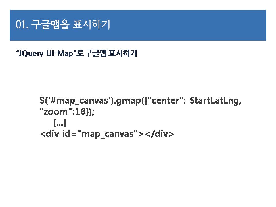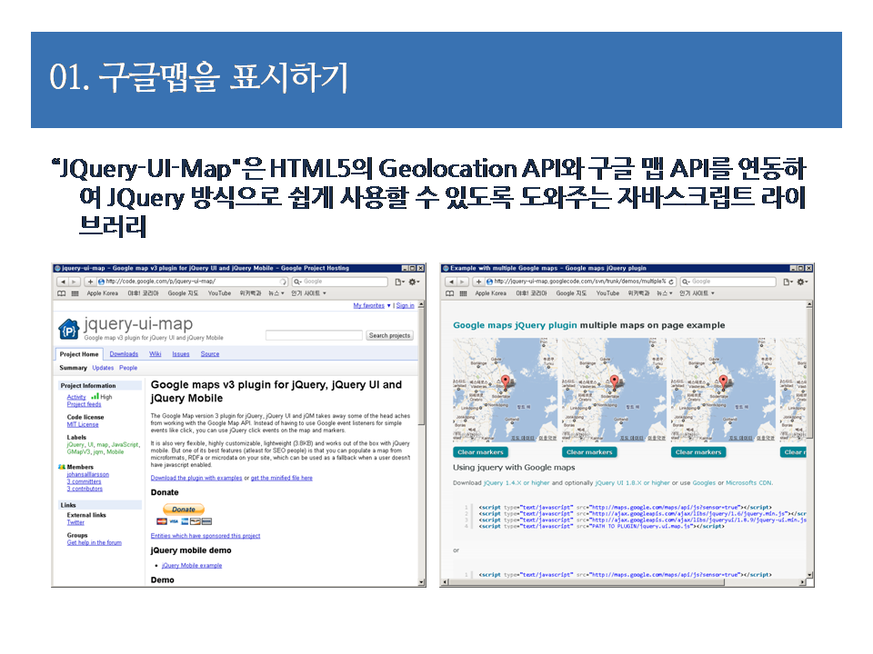 HTML5 GeoLocation API 는 위치정보를 얻을 수 있도록 해주지만 지도를 지원하는 것은 아닙니다. 지도와 연결해서 위치를 표시하는 다양한 응용 방법을 위해서는 구글 맵 자바스크립트 API를 별도로 또 공부해 합니다. 여기서부터 점점 어려운 길로 접어듭니다. 하지만 다행스럽게도 이 문제를 해결하기 위해 JQuery-UI-Map 이 준비되어 있습니다.