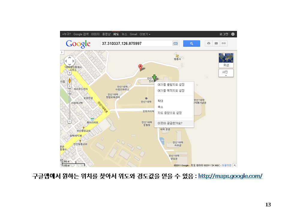 이제 본격적으로 구글 맵에 원하는 부분을 표시해 보겠습니다. 먼저 원하는 위치를 표시하기 위해서는 그 위치에 해당하는 위도와 경도 값을 알아야 합니다. 위도와 경도 값을 얻는 가장 손쉬운 방법은 구글 맵 서비스(영문)를 이용하는 것입니다.