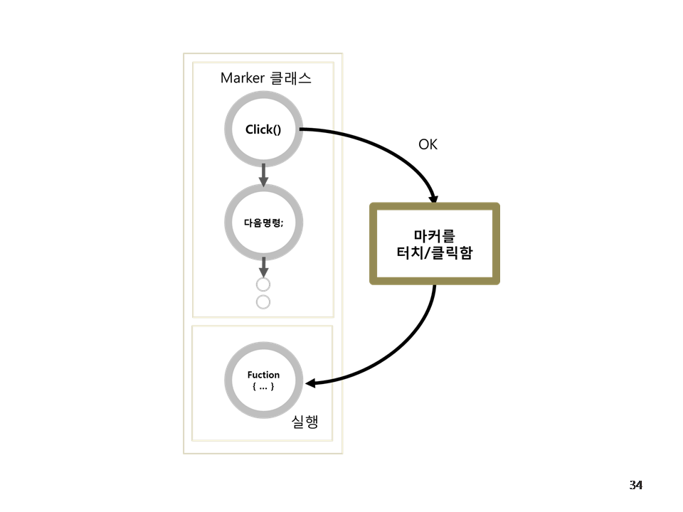 click() 이벤트 핸들러 매개변수에 다시 function(){...}을 넣어서 콜백 함수로 처리한다는 개념은 처음 접하는 분에게는 무척 생소할 것입니다. 사용자가 터치하여 이벤트가 발생하면 이벤트의 처리가 끝난 것이므로 콜백 함수로 순서가 이어져 function() {....} 이 실행되는 것이므로 실행 흐름은 자연스럽습니다. 마커를 클릭하면 click() 이벤트 핸들러 안에 있는 function() {...} 부분이 실행된다고 보면 됩니다.