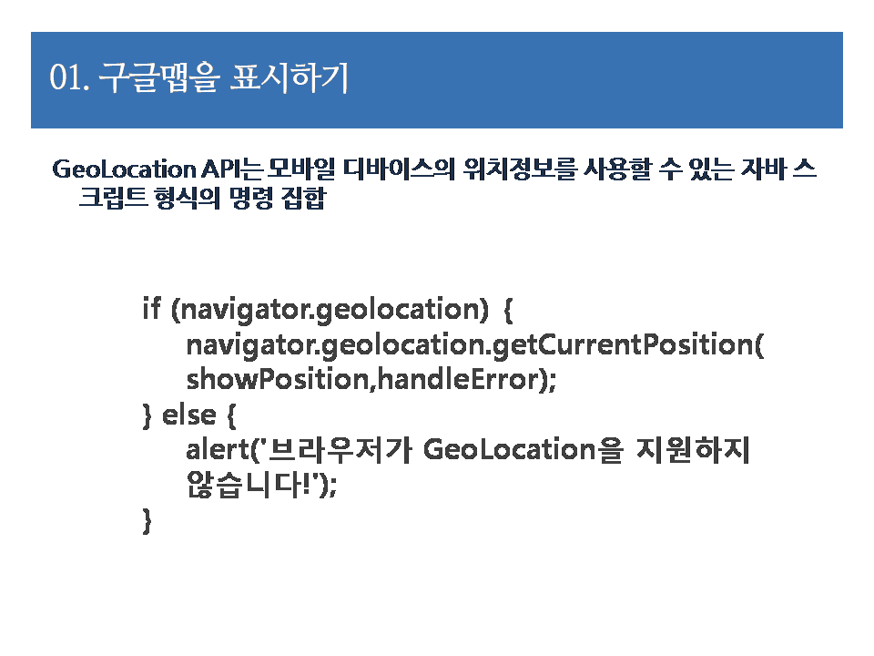 HTML5에는 GeoLocation API를 이용하여 현재 사용자의 위치정보를 얻을 수 있는 자바스크립트 명령을 제공해 줍니다. GeoLocation API 는 모바일 디바이스의 위치정보를 사용할 수 있는 자바스크립트 형식의 명령 집합을 의미합니다.