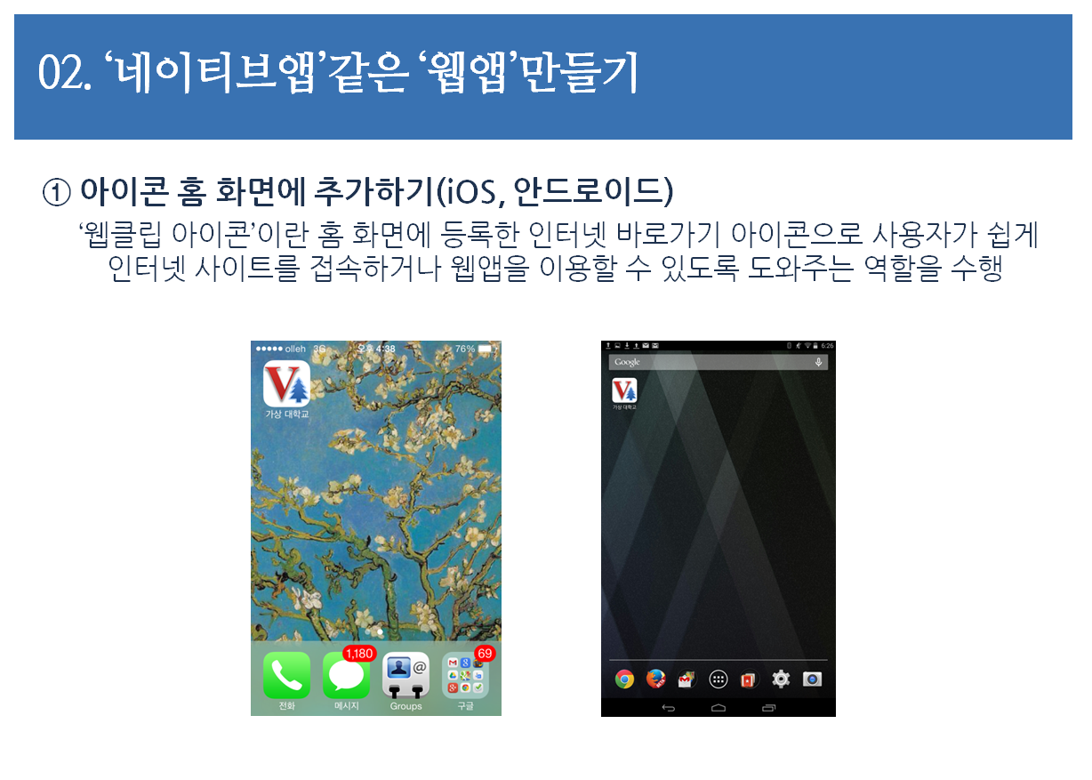 모바일웹은 태생적으로 웹으로 만들어졌으므로 반드시 브라우저를 통해서 접속해야 합니다.
