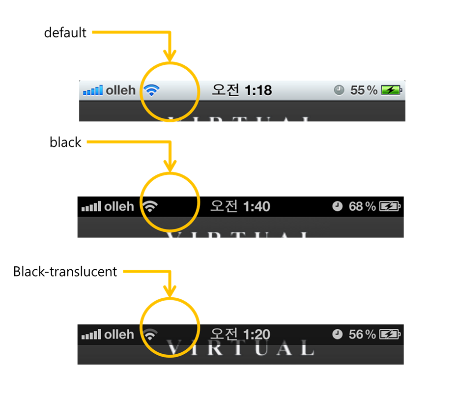 바꾸는 것입니다. 상태바의 스타일은 크게 세 가지 모드를 지원합니다. 다음 그림처럼 일반(default), 검정색(black),