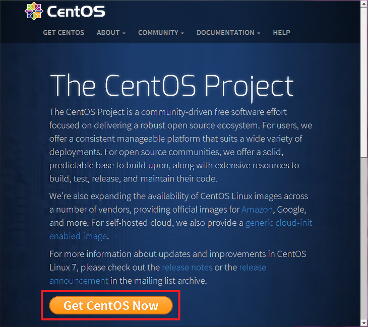 먼저 *.iso 파일을 구하기 위해 CentOS사이트로 이동하여 Get CentOS Now 버튼을 클릭한다.
