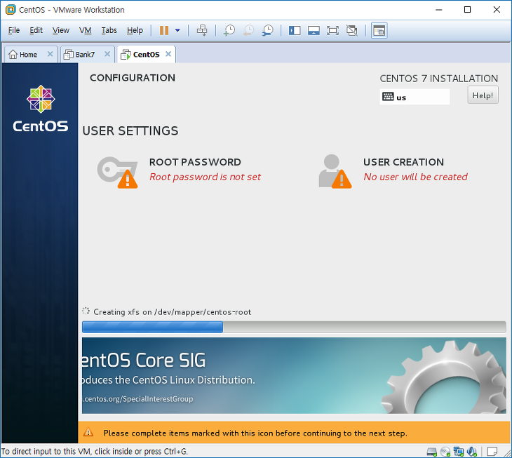 설치를 하면서 root 패스워드와 유저를 생성하라고 표시해주는데, 각각 버튼을 눌러 진행해주면 된다.