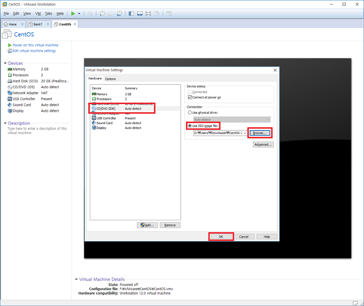 CD/DVD에 위에서 다운받은 CentOS ISO파일의 경로를 지정해준다.