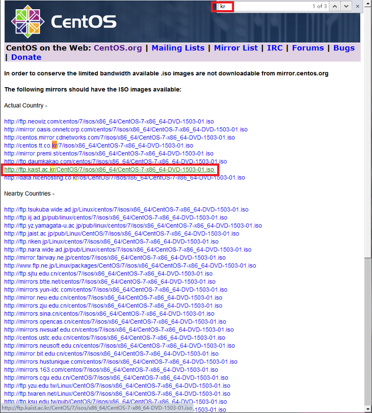 다운로드 받을 곳을 지정해야한다. 필자는 한국에 거주하니 kr로 검색하여 카이스트가 운영하는 FTP 서버에서 다운 받았다.