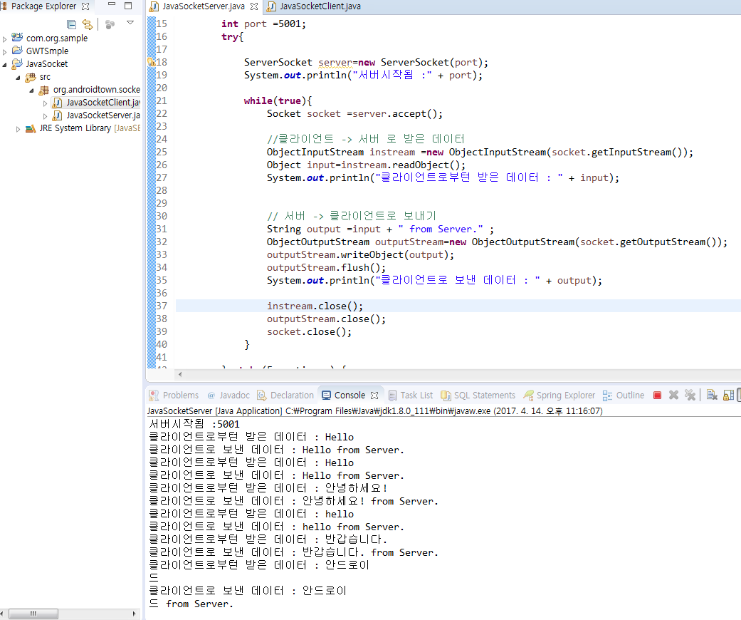 System.out.println("클라이언트로부턴 받은 데이터 : " + input);