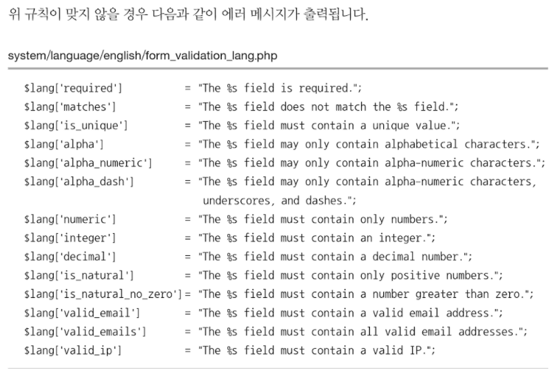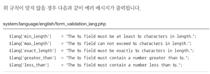 system/languages/english 디렉토리의 form_validation_lang.php 파일을 application/languages/korean 으로 복사하고 영문으로 된 문장을
