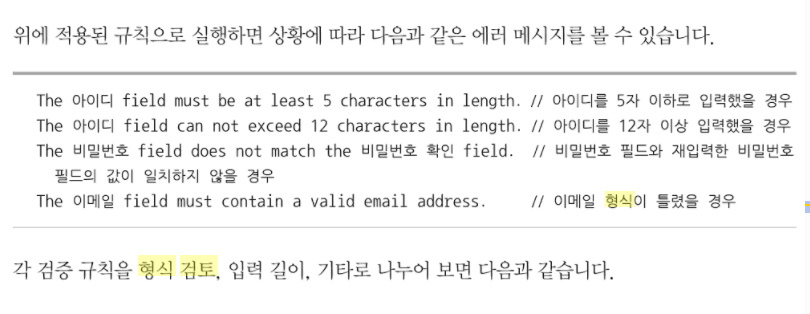 메시지에서는 '아이디' 는 필수 필드입니다. 라고 표시됩니다. 세 번째 파라미터에 폼 검증에 필요한 검사 규칙을 선언합니다 폼 검증에는